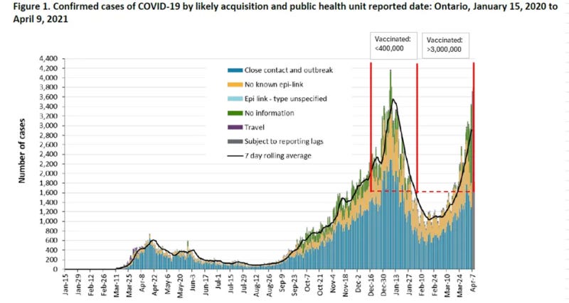 The figure below was taken from the website of Public Health Ontario. The black line shows the 7-day rolling average of new cases. I added red lines that show the study period, divided into two intervals. I also added estimates of the number of vaccinated people in each interval.