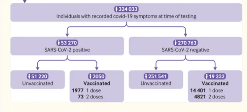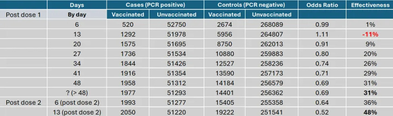 The design was a variation of the case-control study, the test-negative design. Eligible subjects underwent a PCR test because of Covid-like symptoms. Cases tested positive; controls tested negative. As usual, odds ratios were computed, and effectiveness was computed as 1 minus the odds ratio (expressed in percent). The sample size was large: 53,270 cases and 270,763 controls.