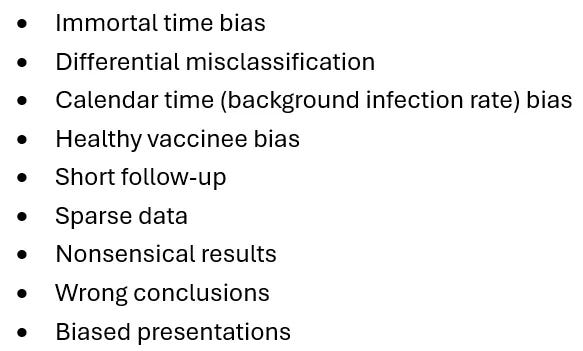 Let’s start reading fearless reviews of studies that reported the remarkable effectiveness of Covid vaccines, which proved to be false. There is no shortage of problems to detect, highlight, and correct, if possible, with actual data or simulations: