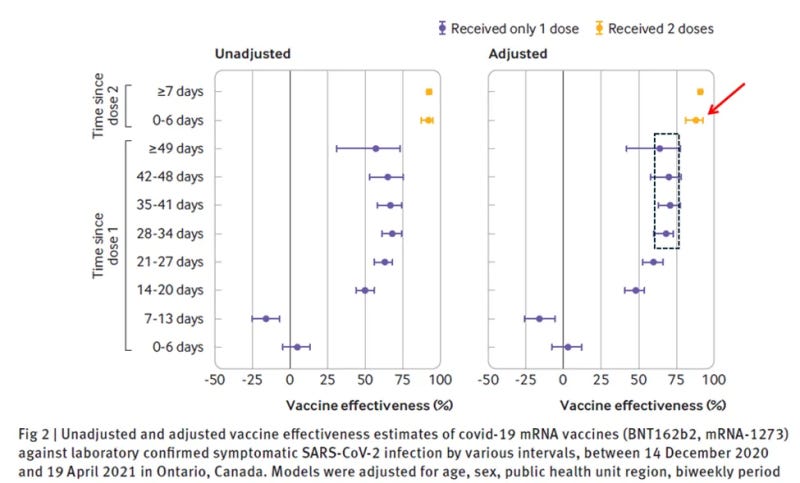 Effectiveness was negative by the end of the first two weeks after the first dose and had reached about 30% before a second dose, not 70%. It has reached only about 50% by the time of full immunity, not 90%. Although my estimates are unadjusted, eTable 2 (supplementary material) indicates that adjustment has hardly changed the authors’ estimates.