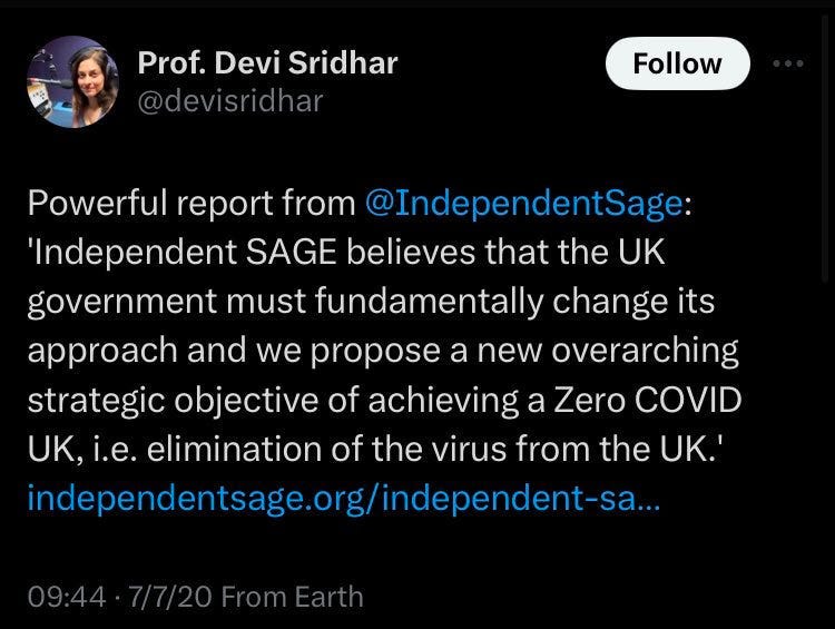 Professor Devi Sridhar, one of the top advisors to the Scottish Government on Covid during the early part of the pandemic, made her fame in 2020 by being a fanatical “zero Covid” advocate.
