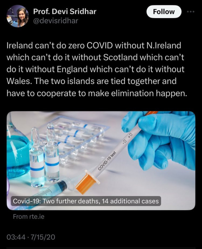 An absurd, nonsensical idea that had no chance of long-term success considering the virus had been spreading globally long before anyone realized it, Sridhar nonetheless had outsized influence on policy making in Scotland, and unfortunately with global impact from a massive social media presence and media promotion.