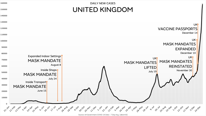 In early 2022, the UK, despite mask mandates and vaccine passports in many locations, was reporting nearly 160,000 new cases each day.