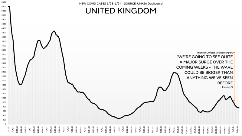 On January 9th, the rolling 7-day average of newly reported Covid cases in the United Kingdom was 938. By January 17th, just over a week afterwards, it had dropped to 750. Eminently qualified “experts” from some of the most prestigious universities in the world predicted a surge from JN.1 that would equal or exceed Omicron, with the promise of the ensuing weeks after January 9th to be an unmitigated disaster of unchecked infections, particularly because of the Christmas/Boxing Day/New Year’s holidays and the traditional gatherings.