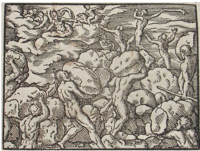 In Greek mythology, the “Gigantomachy” myth describes the desperate struggle between the Gigantes (giants) and the Olympian gods to rule over the universe. In Ovid’s telling of the story, the twin giants Ephialtes and Otis attempt to reach the heavens by stacking the Ossa, Pelion, and Thessaly mountain ranges on top of one another. Ovid writes, “Rendering the heights of heaven no safer than the earth, they say the giants attempted to take the Celestial kingdom, piling mountains up to the distant stars.” But, clearly outmatching them, Jupiter shot his lightning bolts at them, hurling the mountains back to earth and drenching it with “streams of blood.”