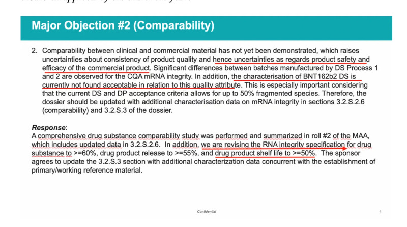The leaked 26 November 2020 PowerPoint presentation of a meeting between Pfizer-BioNTech and the EMA, shown below, reveals how this major objection was shockingly ‘resolved’ – the RNA integrity specification was simply lowered down to 50%, meaning that up to half of all mRNA molecules in the commercial batches were allowed to be truncated (not intact). More importantly, the potential implications of the RNA integrity loss in terms of safety and efficacy were completely unknown.