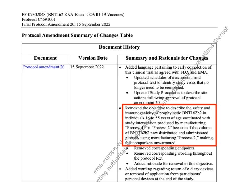 On 15 September 2022, Pfizer removed ‘the objective to describe the safety and immunogenicity of prophylactic BNT162b2 in individuals 16 to 55 years if age vaccinated with study intervention produced by manufacturing “Process 1” or “Process 2” because of the volume of BNT162b2 now distributed and administered globally using manufacturing “Process 2” making the comparison unwarranted.’
