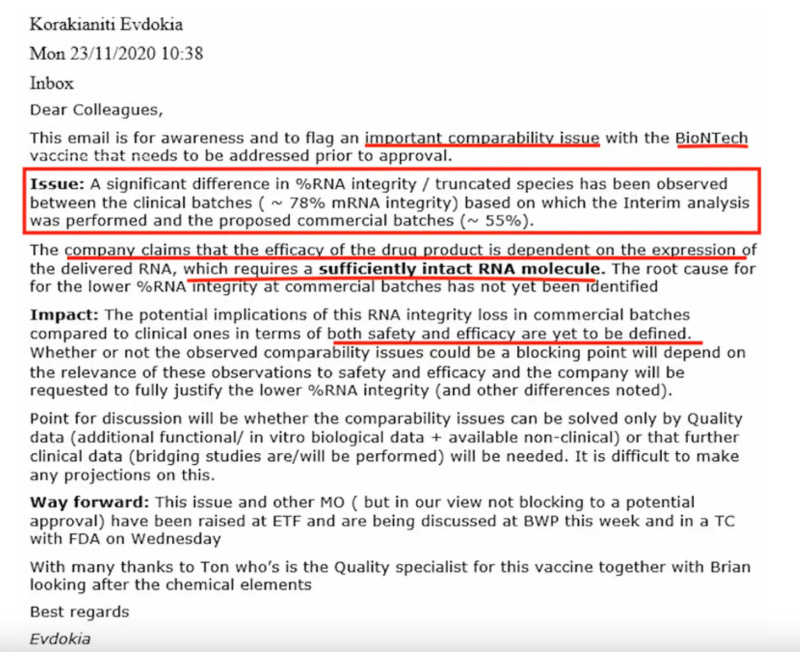I have extensively written on the leaked EMA emails which first exposed the fact that there was a significant drop in RNA integrity. The private internal email from Evdokia Korakianiti (an EMA scientific administrator) to his colleagues, shown below, highlights this significant drop in %RNA integrity in the proposed commercial batches (made by Process 2) compared to the clinical ones (made by Process 1).