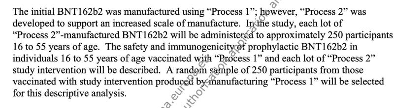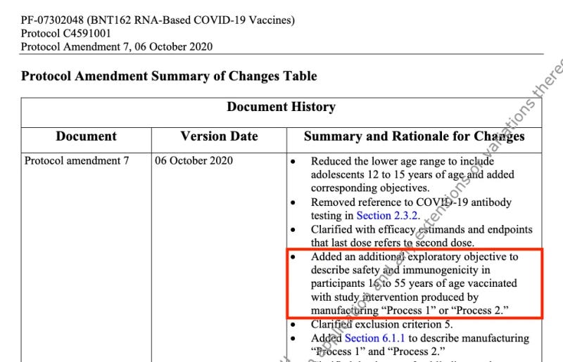 In response to the switch from Process 1 to Process 2 “to support an increased scale of manufacture,” Pfizer added an amendment to its original clinical trial protocol. It promised that it would conduct a comparison study to explore the safety and immunogenicity in individuals 16 to 55 years of age vaccinated with “Process 1” and “Process 2.”