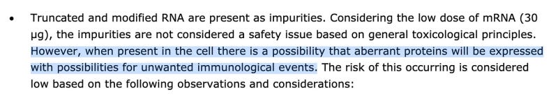 Buried in the EMA’s February 2021 assessment report, a concern was raised by the regulator about the “truncated and modified RNA” and the risk that “when present in the cell there is a possibility that aberrant proteins will be expressed with possibilities for unwanted immunological events.”