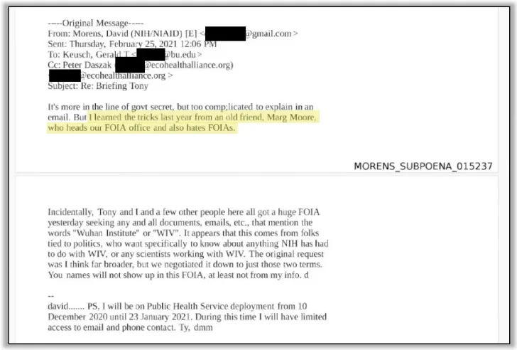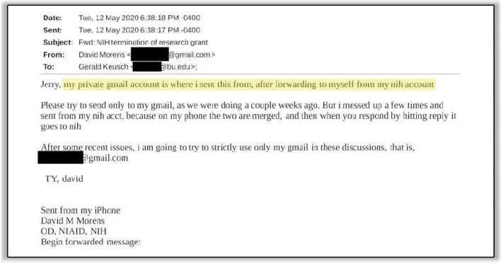Dr. Morens frequently used his personal email to conduct official business, explicitly to avoid FOIA scrutiny. He emailed a colleague in May 2020: “So you and Peter and others should be able to email me on gmail only.”