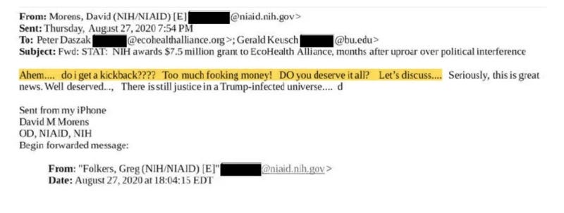 In one particularly shocking email, Dr. Morens asked Dr. Peter Daszak for monetary reimbursement—specifically a “kickback”—for his assistance in editing EcoHealth Alliance’s grant compliance efforts. Although this allegation has yet to be confirmed, the email reads: “…do I get a kickback???? Too much fooking money!”