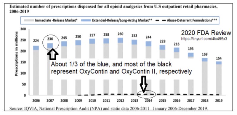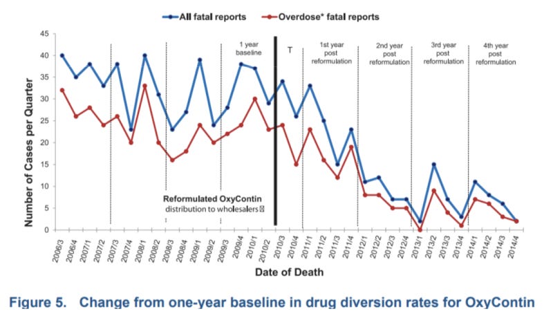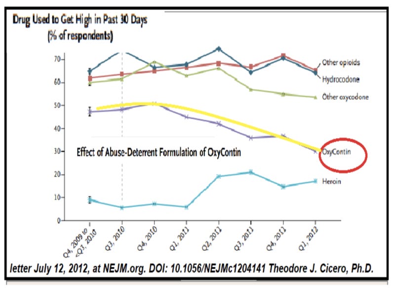 In 2010, Purdue went a step further with the introduction of a groundbreaking “abuse-deterrent formulation” (ADF)—what we might call “OxyContin II”—designed to make tampering difficult and misuse not worth the effort. This reformulation, which had required substantial investment and innovation, was the first of its kind and proved IMMEDIATELY effective in curbing abuse.