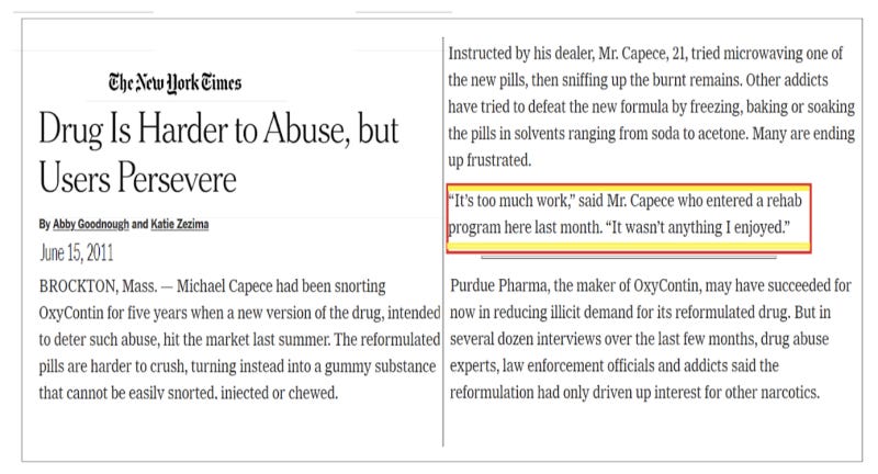 In an industry dominated by generic manufacturers producing much simpler morphine analogues, Purdue’s innovation was rare, and the FDA found it so compelling that similar ADF principles were later applied to government-endorsed drugs like Suboxone (to prevent duplication of methadone’s easy diversion).