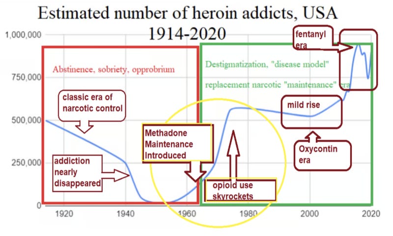 The opioid epidemic exploded one-hundredfold with the unprecedented introduction of narcotic maintenance “therapy,” methadone—an approach never applied to other addictions like alcohol, cocaine, gambling, or sex.