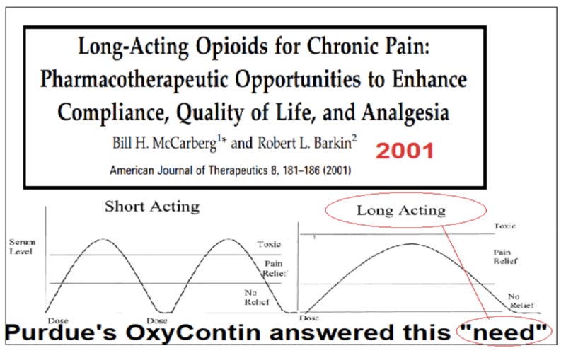 Purdue stood out not because it flooded the market, but because it had developed a “boutique” product (and more importantly in the aftermath, at “boutique” prices)– one crafted in response to the prevailing medical thinking of the time, which emphasized the need for long-acting opioids in managing chronic pain. Studies like 2001’s Long-acting Opioids for Chronic Pain concluded that “long-acting opioids offer distinct advantages over short-acting opioids” by enhancing compliance, quality of life, and stable pain relief.