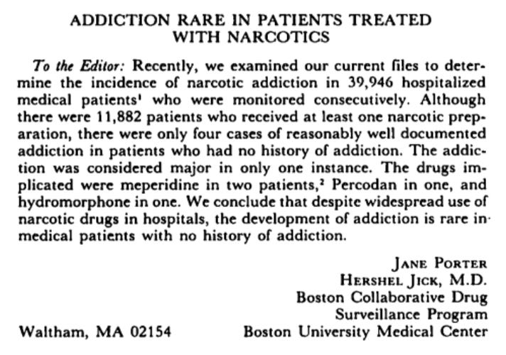Purdue’s marketing efforts relied heavily on studies that suggested addiction was a minimal risk when opioids were used properly for pain management. A now infamous reference was this 1980 letter to the New England Journal of Medicine that claimed the addiction risk for patients with no history of drug abuse was less than 1%.
