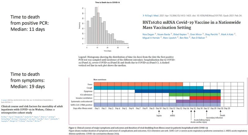 That many reported Covid deaths were not caused by the virus is also evident from the distribution of the time to death in the study. The median was only 11 days after a positive PCR test (top figure), shorter than the typical distribution after the onset of symptoms (bottom figure) — a median of 19 days — even if testing happened 1–3 days after symptom onset. In other words, the distribution was shifted to the left, as compared with what we expect to see in the case of true Covid deaths.