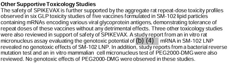 Under the heading “Other Supportive Toxicology Studies,” this regulatory submission demonstrates the gross inadequacy of the testing performed for SPIKEVAX, which despite this inadequacy apparently still exceeds the testing performed for COMIRNATY. The SPIKEVAX documentation refers to an in vitro (ergo in a test tube) rat micronucleus assay of the formulated mRNA. No mention is made of any level of DNA fragment contamination in the tested preparation. The in vitro rat micronucleus assay is a method for rapidly testing the activity of a pharmaceutical or radiologic treatment in grossly disrupting chromosomes. It is completely inappropriate and incapable of detecting insertional mutagenesis. PEG2000-DMG is one of many components of the lipid nanoparticle, and these test results are irrelevant to the questions raised by the Surgeon General, as neither mod-mRNA nor DNA fragments were tested, and once again the tests performed would fail to detect any integration events.
