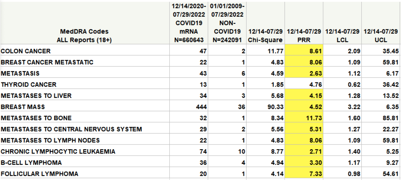 In the table (highlighted in yellow), a safety signal is considered to be significant, and worthy of further investigation, if the value in the column marked PRR exceeds 2 and the value in the Chi-Square column exceeds 4.