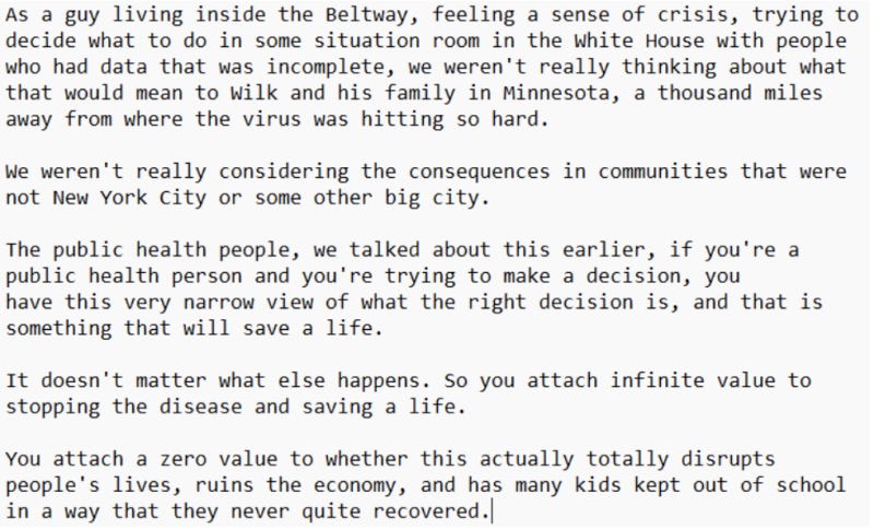 Dr. Collins presupposes that the lockdown measures over which he expresses remorse saved lives. Whereas the consequences of his "public health mindset" was that the lockdown "totally disrupts people's lives, ruins the economy, and has many kids kept out of school." All "Collateral damage." Do you see what he's done there? He regrets that the harsh measures he advocated saved lives, but at the cost of being a real bummer for everyone. But the assertion lockdowns saved lives is tendentious, and ignoring that lives were lost due to the harsh measures is absurd.