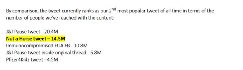 Showcasing the agency’s front and central role in promoting propaganda, the author, Erica Jefferson, an associate commissioner for the FDA’s external affairs, boasts to Dr. Janet Woodcock, the FDA’s acting commissioner, how the “Not a Horse Tweet” got 14.5 million tweets. (See below)