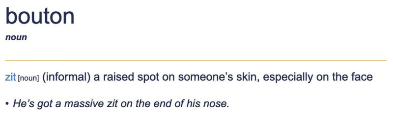 It seems there are no coincidences. The universe has an impeccable sense of humor. The part-time ER doctor who was the Maine Board’s expert witness against me was named Dr. Faust. I wondered what the French word “bouton” meant, and the answer was very surprising. Hard to believe. But the Cambridge dictionary insists it is so. It means “zit” in French. If I had a name like that, I’d be a mean son of a gun too.