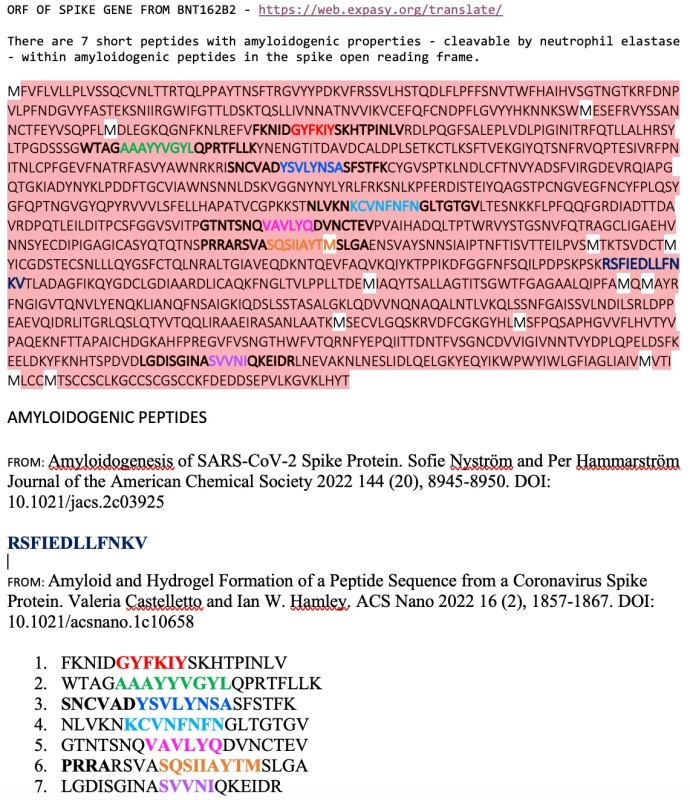 Figure 1 demonstrates that there are at least 8 amyloidogenic peptides in the spike protein as per the BNT162b2 code. My concern is that in the context of high fidelity translation, at least one of these peptides are produced and cleaved into amyloidogenic peptides to induce proteinopathy. The degree and type of damage will depend on the locations of proteins being produced.