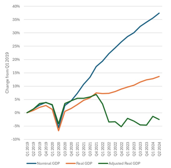 This yields an adjusted real GDP significantly below the official real GDP figure estimated by the BEA: Instead of a 13.7 percent increase, the adjusted real GDP shows a 2.5 percent decrease from the first quarter of 2019 through the second quarter of 2024.