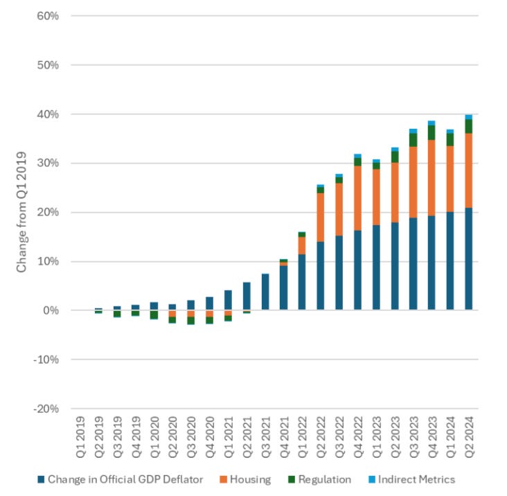 The housing component has had the largest impact in terms of adjusting for the true cost of living; in the second quarter of 2024, it increased the cumulative change in the GDP deflator by roughly 75 percent. This was due to the combination of not only higher home prices but also higher interest rates. That is, a mortgage payment is made of the amount borrowed and the interest rate, and if both house prices and interest rates are rising then the cost of home ownership rises on both fronts.