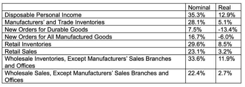 Note that not only are the inflation adjustments large, but they are highly variable, ranging from under 20% for wholesale sales to 22% to 23% for manufacturing inventories and new orders.