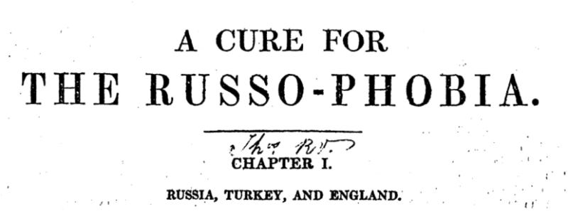 There appeared in 1836 in Britain a guidepost in this Anglo tradition. It is a pamphlet by Richard Cobden. The top of the first page of text showed the title “A Cure for the Russo-Phobia.”