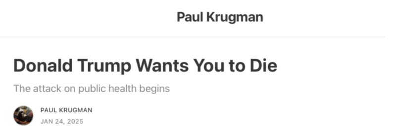 It is certainly not the case that Donald Trump wants you to die, contrary to Paul Krugman’s claim. No longer writing at the New York Times, he reserved his rather extreme view for his Substack account.