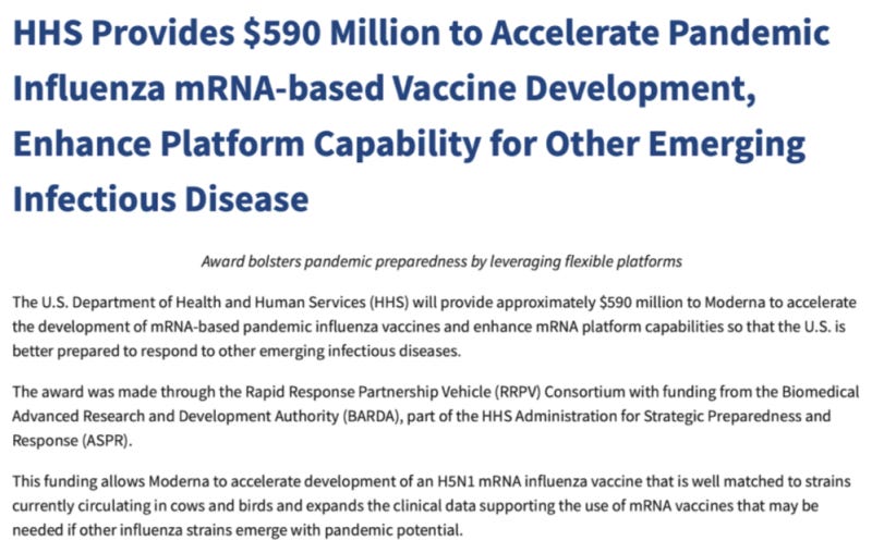 The Department of Health and Human Services announced on January 17, three days before the inauguration, a jaw-dropping $590 million grant to Moderna, a driving force behind global vaccination with mRNA shots during Covid. The announcement of this grant changed the fortunes of the company’s stock price, which had been in a two-year slide.