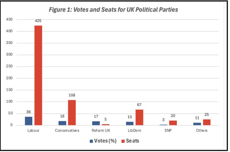 The latest YouGov UK poll on 25 June has Labour leading at 36 percent, followed by Conservatives 18, Reform 17, and Liberal Democrats 15. Based on these, their modeling projects Labour winning 425 of Parliament’s 650 seats (65.4 percent), Conservatives 108 (16.6), Reform 5 (0.8), and Liberal Democrats 67 (10.3). Thus Labour with about one-third of votes would win almost two-thirds of seats; the Conservatives, level-pegging with Reform in votes, would win 22 times as many seats; Reform would win less than one-third of its vote share in seats; and the LibDems, with only four-fifths of the Reform share of votes, would have thirteen times as many seats. The extent of the distortion is shown visually in Figure 1. Another poll from People Polling actually has Reform ahead of Conservatives 24-15.