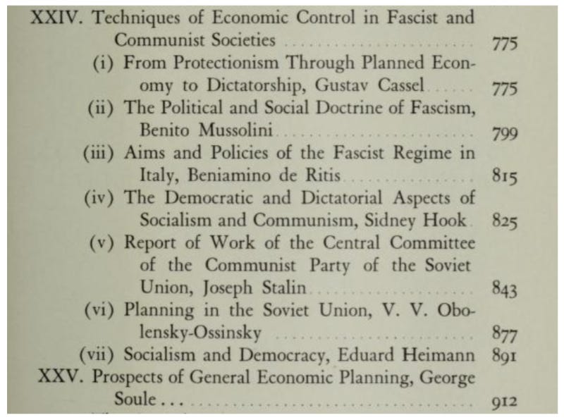 You will notice that the section on economics includes contributions by Benito Mussolini and Joseph Stalin. Yes, their ideas and political rule were part of the prevailing conversation. It is in this essay, likely ghostwritten by Professor Giovanni Gentile, Minister of Public Education, in which Mussolini offered this concise statement: “Fascism is more appropriately called corporatism, for it is the perfect merge of State and corporate power.”