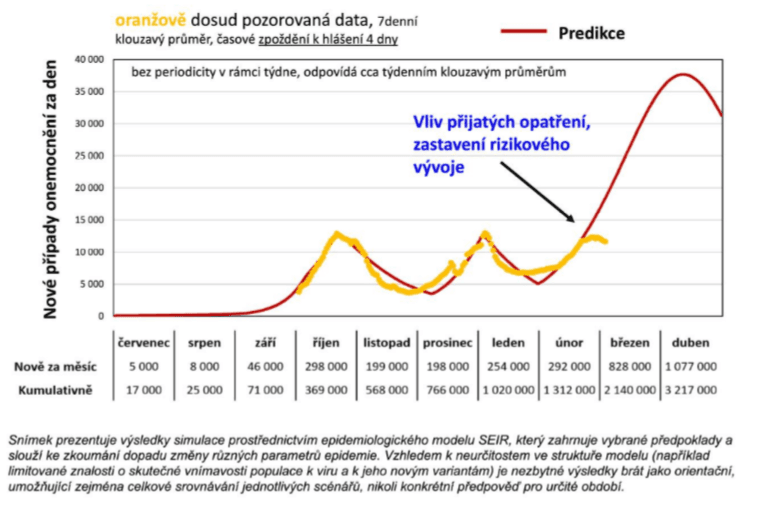 The figure is in Czech, sorry for that. The horizontal axis shows time in months from July 2020 to April 2021. The vertical axis shows the number of new cases of Covid per day (i.e., positive PCR tests) in the Czech Republic. Yellow dots represent real data and the red curve is the “prediction” of the Ministry of Health model. The “prediction” was made around the time of the black arrow. The blue text says “the effect of counter-measures, dangerous development averted” (it makes no more sense in Czech, the translation is verbatim). The disclaimer in italics at the bottom of the slide is explained below.