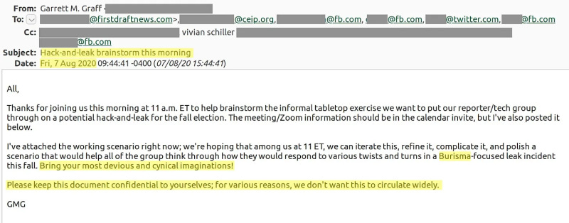 Attendees, including First Draft, work-shopped how to snuff out such “disinformation” before it could take hold in the public consciousness. “Bring your most devious and cynical imaginations!” exclaimed Garret Graff, the Aspen Institute’s Director of Cyber Initiatives, in the invitation to First Draft and others: