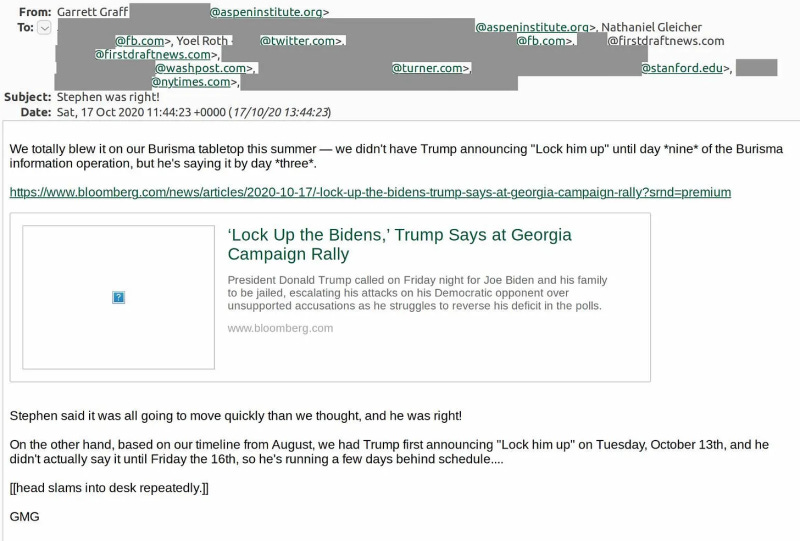 The Twitter Files revealed that the Aspen Institute organised a “table-top exercise“ to gameplan a response to (a supposedly fictional) laptop belonging to Hunter Biden, the contents of which suggested corruption relating to Ukraine’s Burisma energy company and the Biden family. That event occurred in August of 2020, when the verified laptop had supposedly only been in the possession of the FBI, the New York Post, and the Trump campaign team.