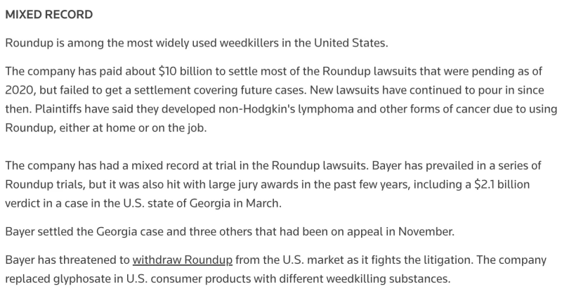 Once there was a win—and the jury awarded the plaintiff with non-Hodgkin’s lymphoma hundreds of millions, later reduced—the bandwagon effect began, with other lawyers seeking plaintiffs to sue Monsanto. Eventually over 100,000 plaintiffs were suing Monsanto/Bayer for cancers related to glyphosate, the so-called active ingredient in Roundup. There are other ingredients that are probably toxic too, but they were not at issue. Most plaintiffs were homeowners. Bayer then removed glyphosate from Roundup, producing a new formulation for homeowners.