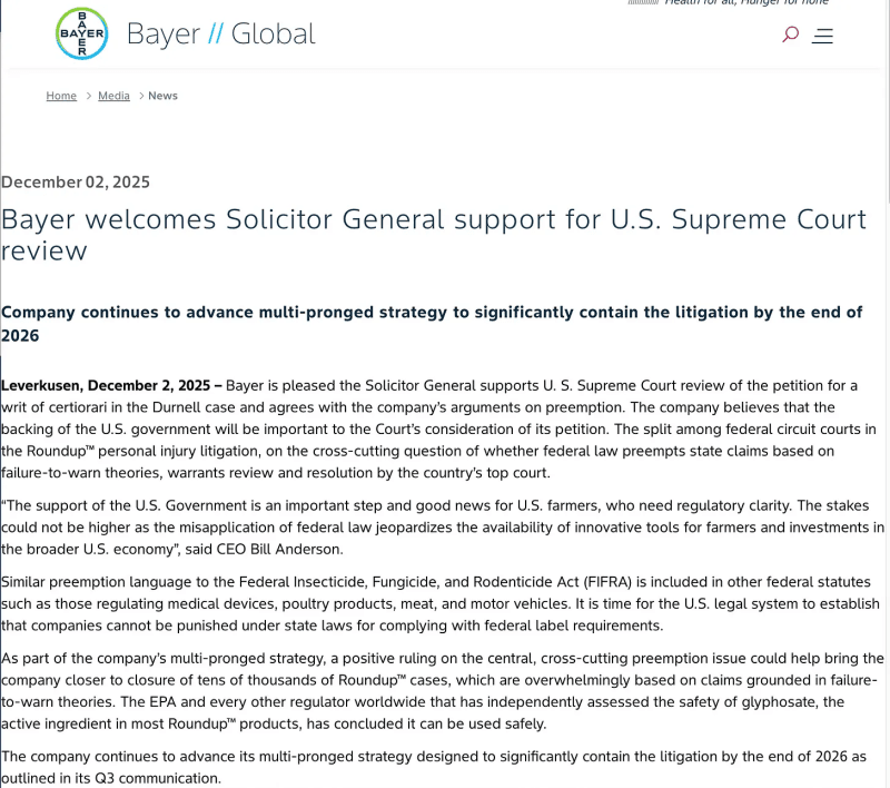 Bayer/Monsanto filed its request for a writ of certiorari (a request to take the case) with the Supreme Court on April 4, 2025.